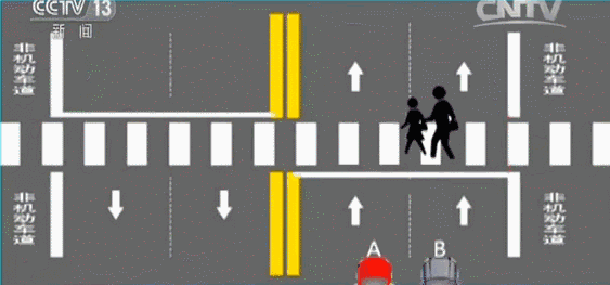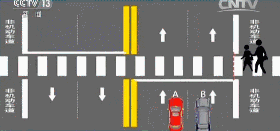 2.当行人行走到图中这个位置时,A车需要礼让停车,等待行人通过;B车辆可以不用让行,直行通过。