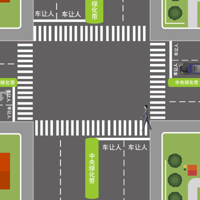 3.行人正在绿化带处的斑马线上,没有进入机动车道的斑马线时,机动车可以直行通过。